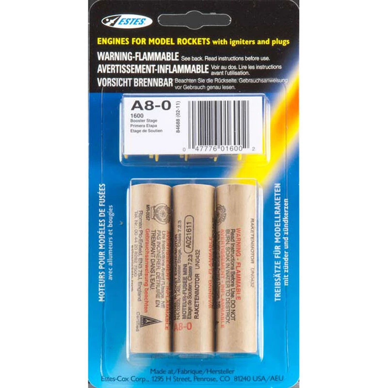 The Estes A8-0 engine is a booster stage engine designed for model rocket flight and has to be used with a standard engine. This engine is for flights in rockets weighing less than 4 ounces, including the engines. Each package includes 3 engines, 4 starters and 4 plugs.