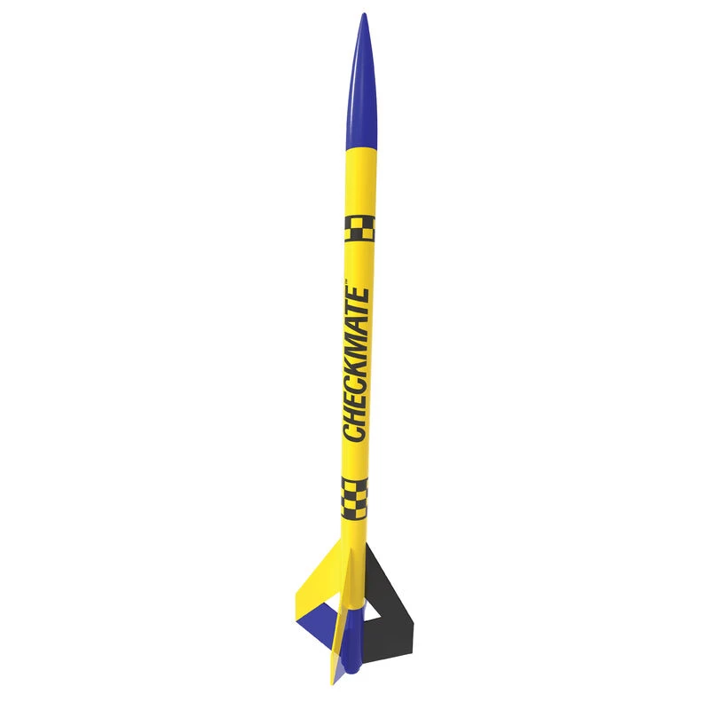 The Checkmate launches on mini engines (sold separately) and recovery is streamer for the rocket and tumble for the booster. Prepare for re-launch with a new Estes engine, wadding, a starter and starter plug.