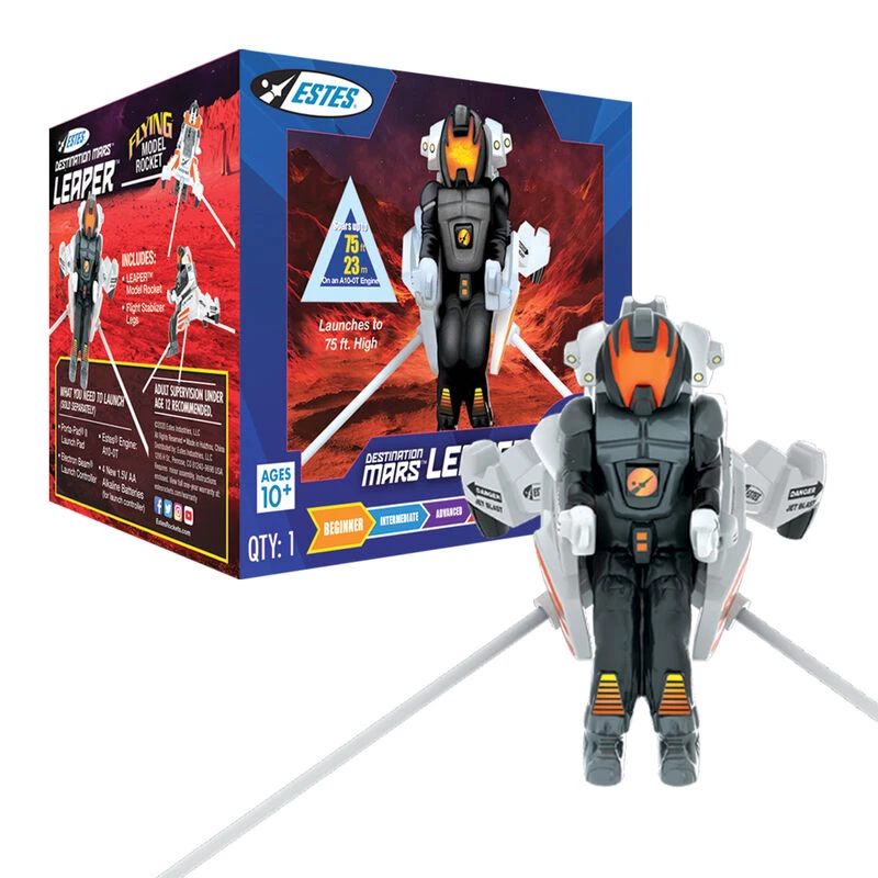The easy-to-assemble Leaper is an exciting addition to the Estes Destination Mars collection. You’ve never seen a model rocket like this before! Constructed from durable EPP foam, the Beginner-Level Leaper is a prefinished rocket that can be ready to launch in minutes. No gluing, sanding, or painting required for this kit. Simply insert the stabilizer rods and your model is ready for the launch pad. The lightweight Leaper features featherweight recovery – at the peak of flight, the engine ejects, shifting the rocket’s center of gravity for a gentle, upright landing without a parachute or streamer. Amazing! On launch day, prep the Leaper for flight with the recommended Estes A10-0T engine. There’s no engine hook – just add a few layers of masking tape around the middle of the engine for a friction fit and engine retention during flight. At launch, balanced by the extended stabilizer rods, the Leaper can reach up to 75 ft. – high enough to impress but still low enough to track. Modest altitude flights also make the Leaper a great choice for small flying fields. At apogee and engine ejection, the Leaper rights itself and lands safely on its tripod legs. Mars survey mission completed – ready to launch again!